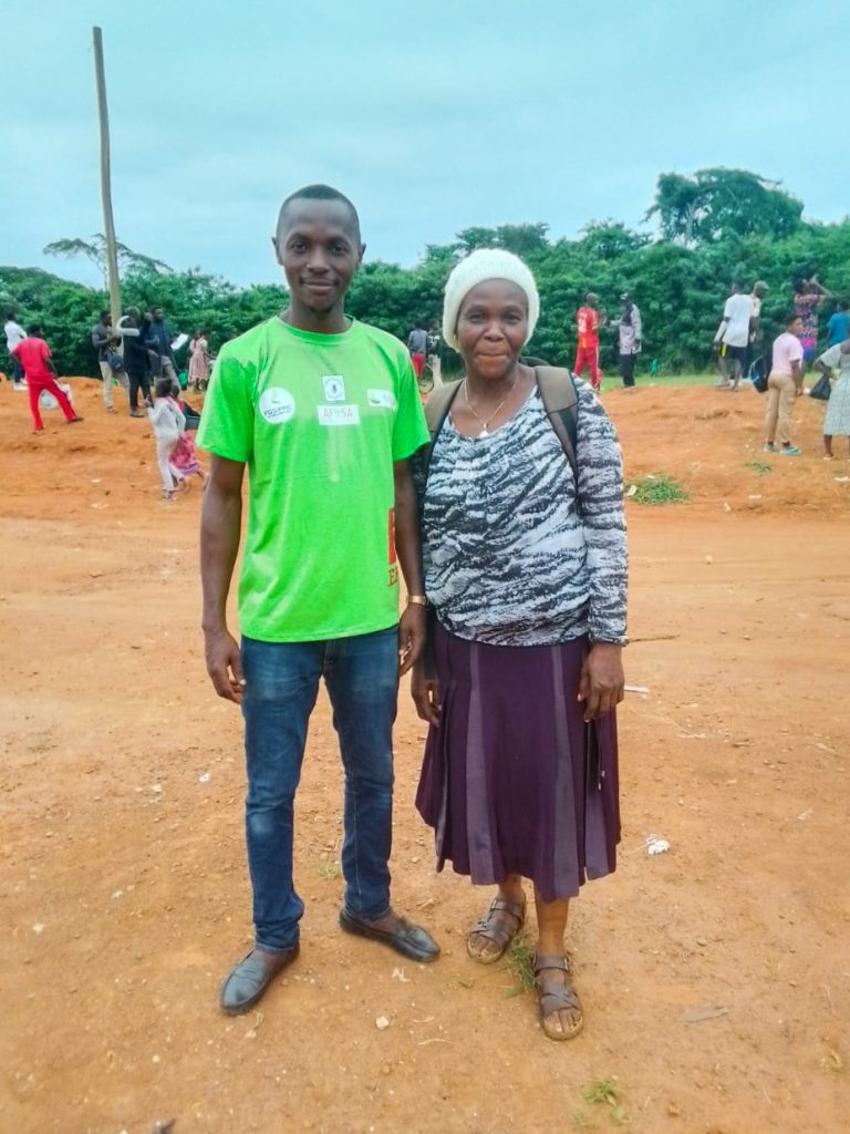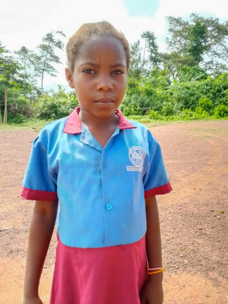 Dies ist die Familie von Bonaventure, er ist in der ersten Klasse der Grundschule. Er lebt mit seiner älteren Schwester und seinem jüngeren Bruder (dem Baby) zusammen. Seine Mutter backt Krapfen, um die Familie zu ernähren. Im Video sammelt sie Palmöl, um die Krapfen am Morgen zu backen.